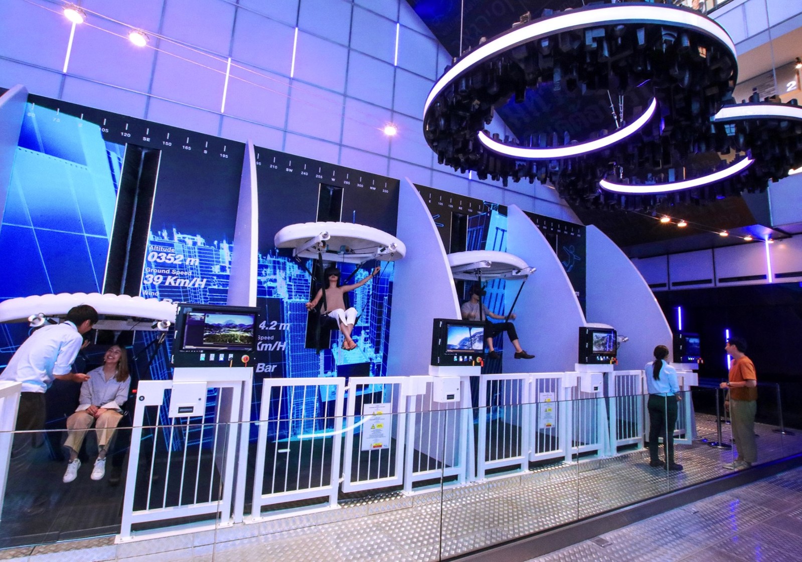 Working with a pedestrian simulation tool like Oasys MassMotion provides clarity on visitor potential behaviours, it allows alterations to an installation in the design stage to predict how visitors pass through. Designs can be optimised for health and safety, avoiding congestion, and most efficient patron circulation. With that in mind, to help visualise and analyse pedestrian behaviour with ParadropVR, we called upon Oasys to advise us on how to configure the ParadropVR units. The units are modular, they can be configured in circles, multi-storey or in space-limited areas therefore the optimal configuration will depend on pedestrian traffic flow and will vary with each location. The MassMotion software takes into account load, journey and exit times, and will provide data, demonstrating how best to manage space around ParadropVR.